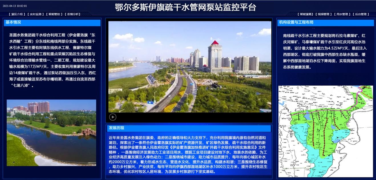 工程介绍界面:本页面展示介绍项目的基本情况,历史发展,水利设施介绍,可播放现场实时视频画面或工程的宣传片 。