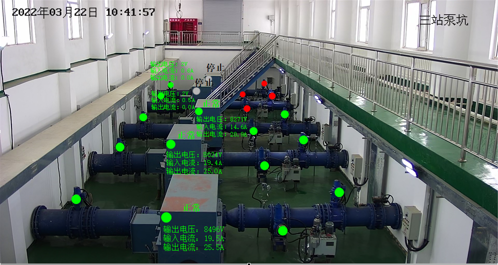 系统三维组态:泵站数据可直接在管网GIS界面直接点击图标进入,也可在实时监测的界面点击进入。能动态的监控加压泵、阀门的起停状态,泵的工作电压、电流、运行频率、蓄水池的液位,泵站管网的进出口压力。管线的瞬时流量、累计流量等,可根据供水情况及时合理的关开阀门,起停水泵,合理配水,及时对泵的异常状态、如过流、过压、水池的液位过高、过低,阀门的故障等给予及时报警。