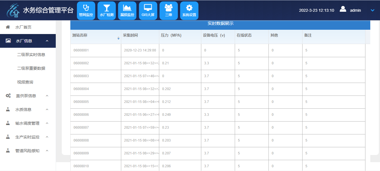 数据中心:显示内容包括所有监测点的实时数据、历史数据、统计分析报表等。实现该流程的监测采集,包括厂站数据、管网压力、流量和水质、用户水量等数据。