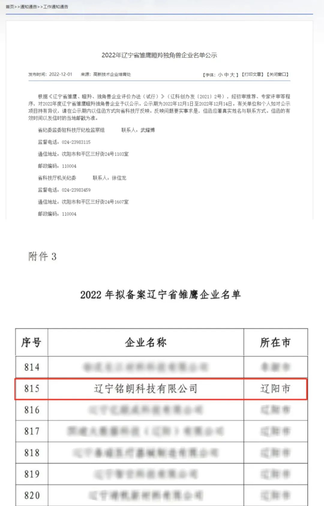 2022年辽宁省雏鹰企业名单,铭朗科技荣登榜单!